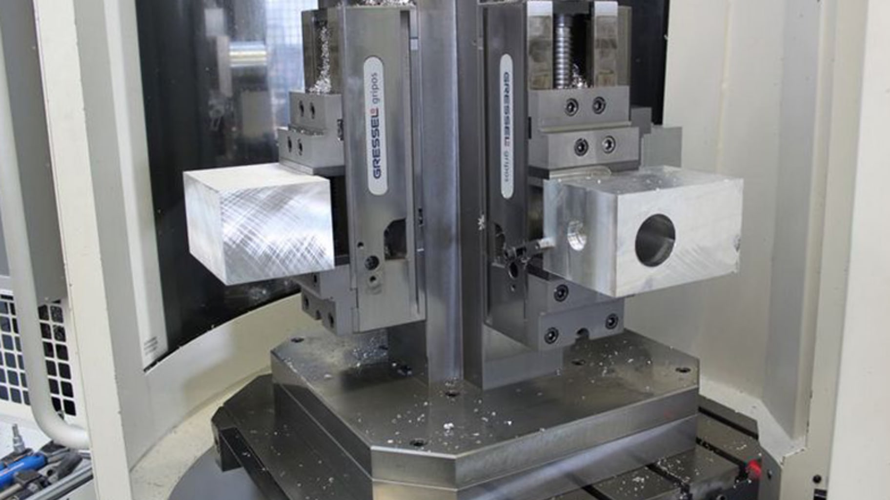 Spannlösung auf einer Fahrständermaschine mit 24 Töpfen mechanischem Nullpunkt Spannsystem gredoc und speziellen Unterbauten
