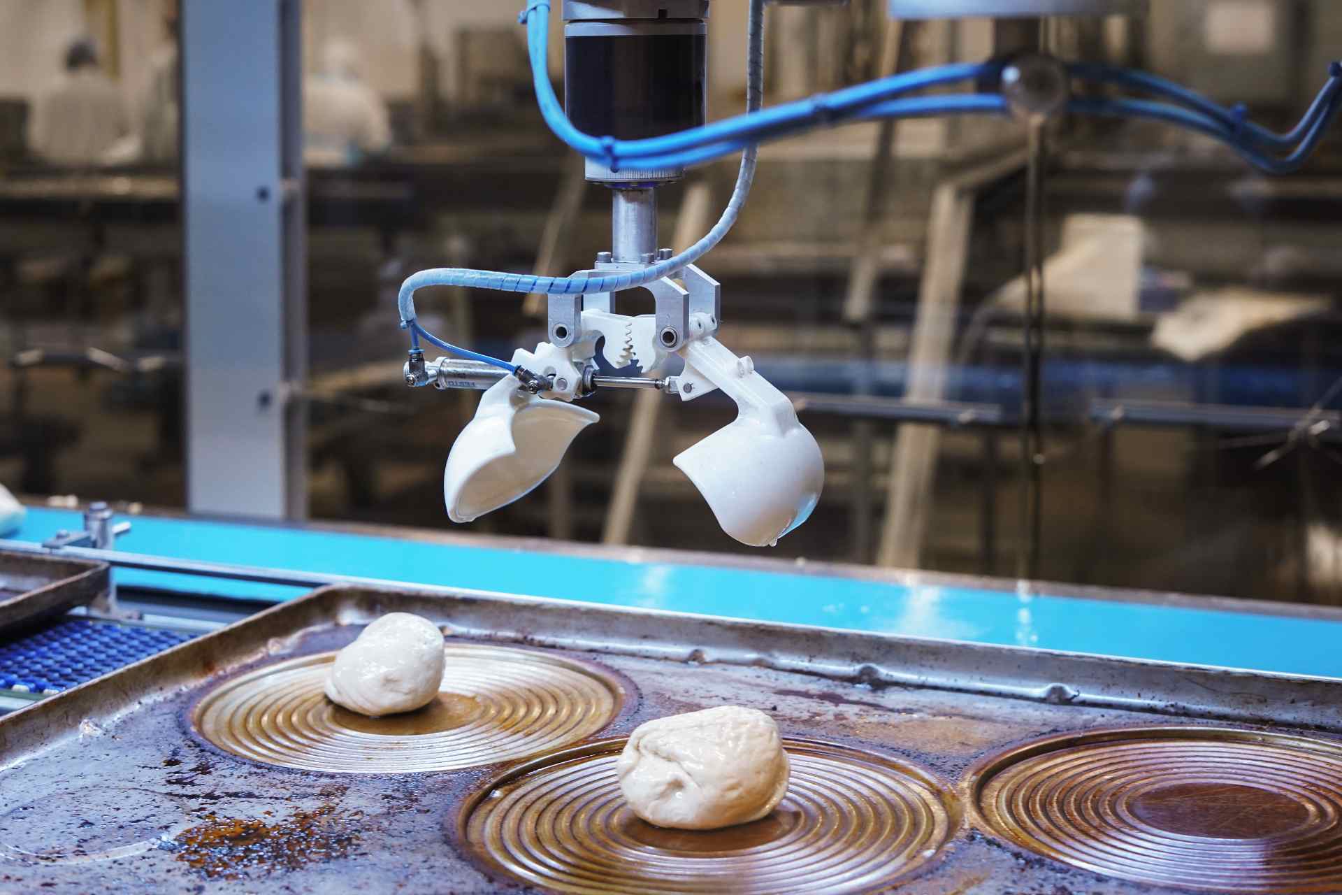 Schubert implemented a solution using three F4 four-axis pick-and-place robots, equipped with scoop-shaped tools designed to gently handle dough balls. The robots place each dough ball precisely at the center of the pan before pressing, ensuring consistent crust shape and quality.