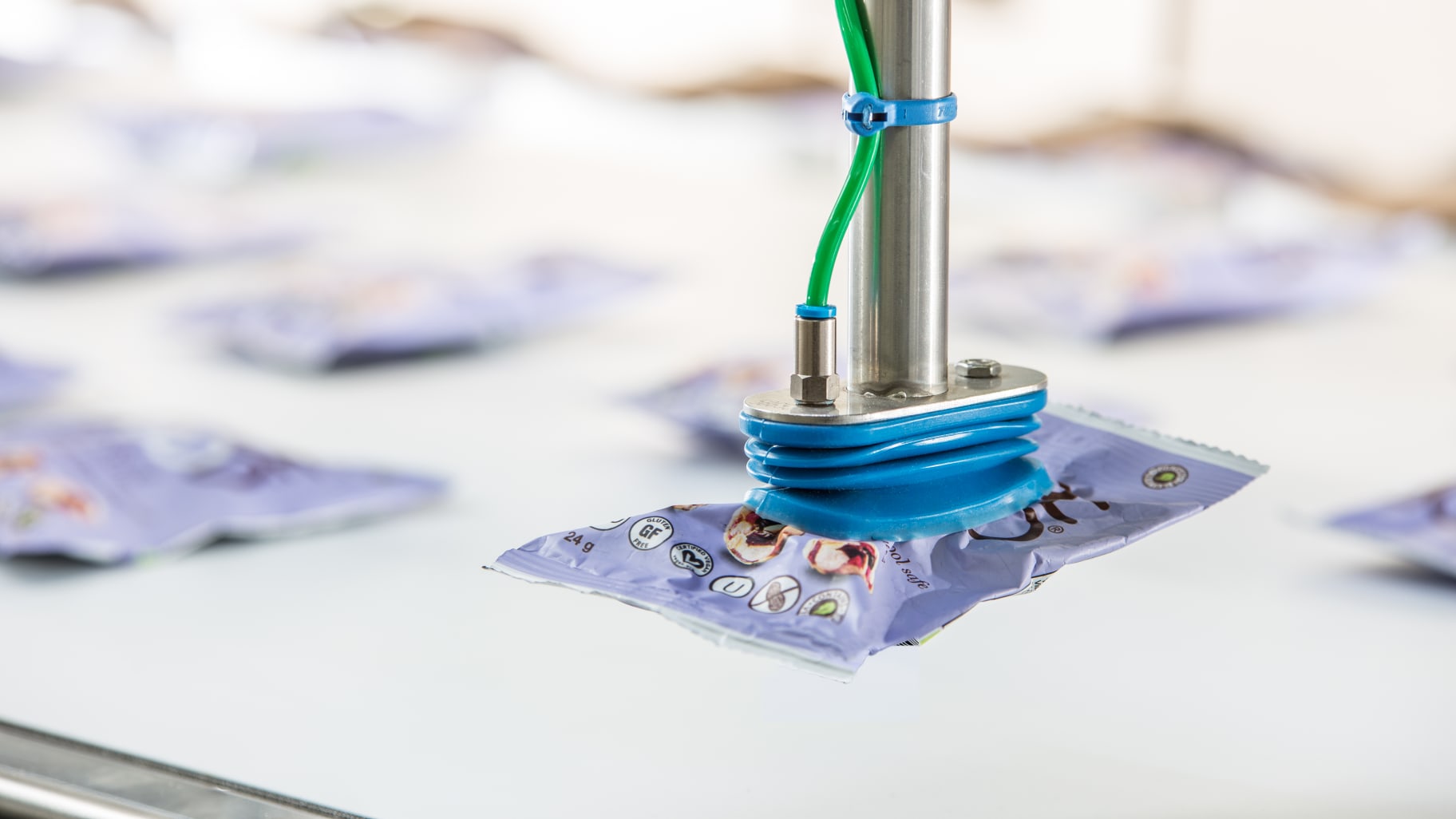 Packing of snacks in flowpacks into cartons: Schubert scores points with Riverside Natural Foods thanks to a flexible picker line and a service site close to the customer in Canada.